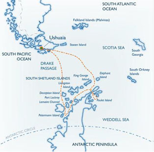 Les itinéraires des voyages de 9 nuitées offrent une journée de moins à Péninsule Antarctique et les Iles Shetland du Sud.