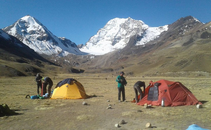 Nous partons à flanc de montagne pour rejoindre la magnifique vallée de Chacha Kumani, que nous atteignons au bout de 2 heures (4430m). Nous montons de l’autre côté de la vallée jusqu’à un col situé à 5000m. Pour cela, nous montons d’abord sur un premier plateau situé à 4600m après une heure de montée, puis un deuxième plateau situé à 4750m (30 minutes) avant d’arriver dans un pierrier abrupt au pied du col (4945m). Trois heures de montée au total seront nécessaires pour atteindre ce col (5000m) qui nous offre une vue magnifique sur le Glacier Chachakumani. Nous descendons dans la vallée Pura Purani en moins d’une heure (4750m).